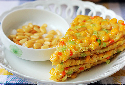 6、等到玉米烙底部凝固并金黄后,翻面,正面再加热2分钟即可,出锅后,切块即可食用,爱吃甜的可以表面再撒点糖,喜欢奇特的撒些番茄酱或是巧克力酱也是可以滴