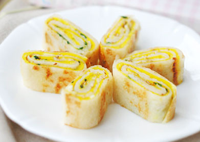 6、待蛋液即将凝固的时候将饼卷起,一定要在蛋液还没完全凝固的时候卷起,这样才能裹得成型