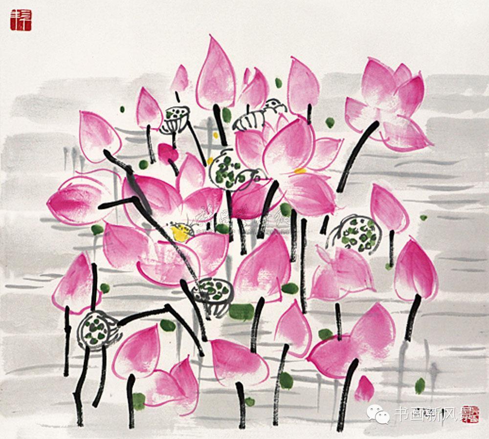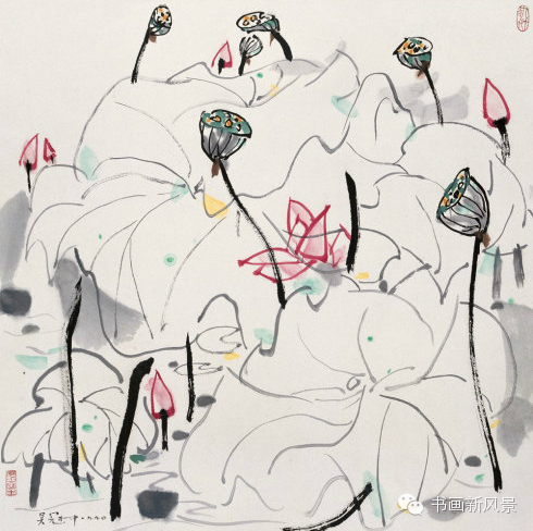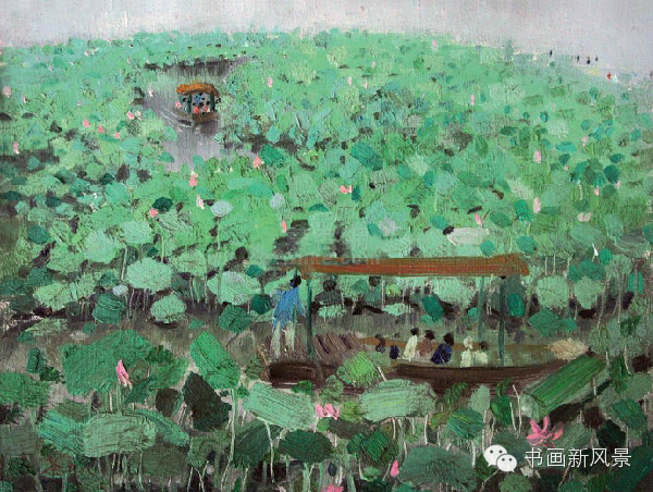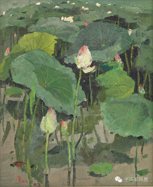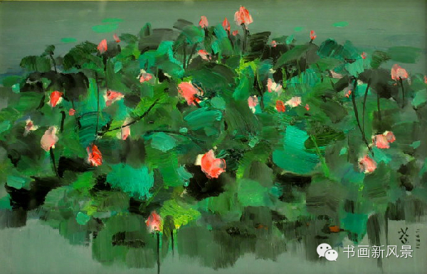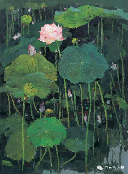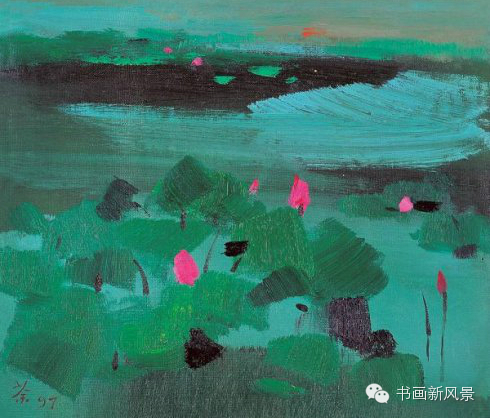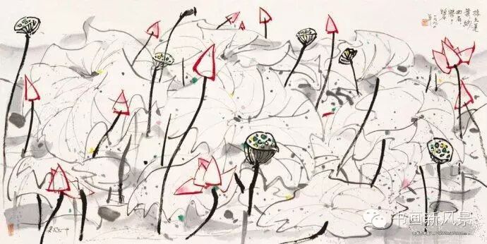 吴冠中:中国传统绘画中的荷花卷轴汗牛充栋,但那些程式化了的荷图并不令我激动。而荷塘中大块小块叶片之交错,曲线直线穿插之繁杂,连倒影也已被包围进叶丛中,难分水上水下,似乎我只是叶底的昆虫,迷途於花叶的迷宫。我作过不少残荷,着眼于线之曲折,倒影的荡漾,垂莲的点缀,这回彩绘浓妆,似乎想饱餐浓叶重彩的盛宴,愿读者有同样的好胃口。