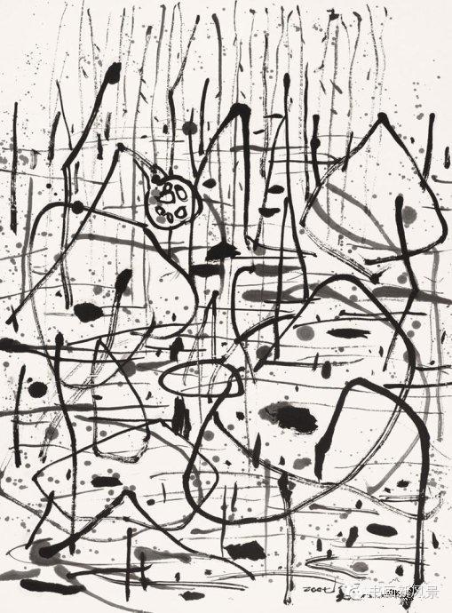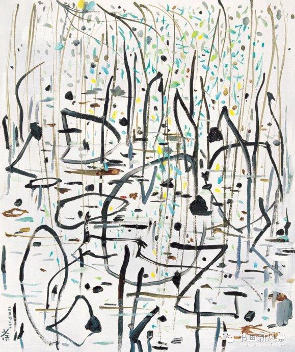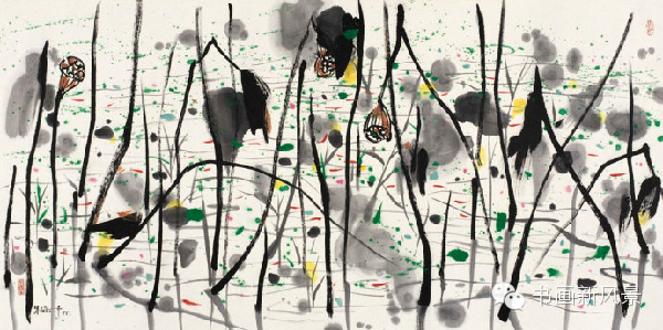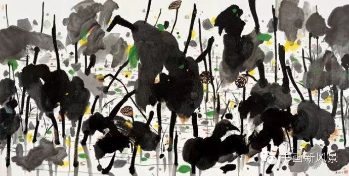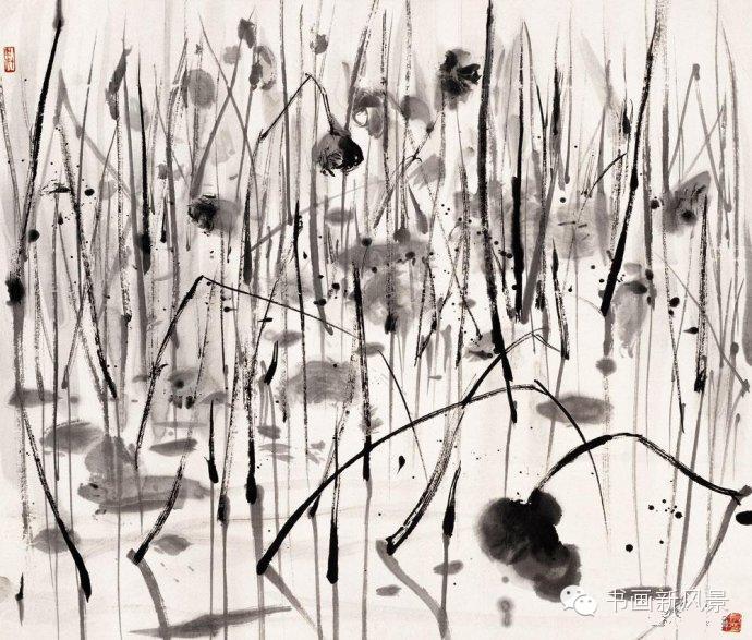 吴冠中:汽车在田野奔驰,庄稼地一色金黄,已是丰收季节。虽富饶,但田野形象单一,不易入画。突然,出现一大片残荷,水面枯枝交错,残叶与莲蓬卷缩得难辨形体,都似无意挥写泼散的黑块与黑线。这些线与块显得分外动人,是借助了水里倒影,由于倒影,一再重复叠映了块与线,虚虚实实,不易一目了然,倒仿佛利用水袖强调了舞蹈的节奏,余韵悠悠。