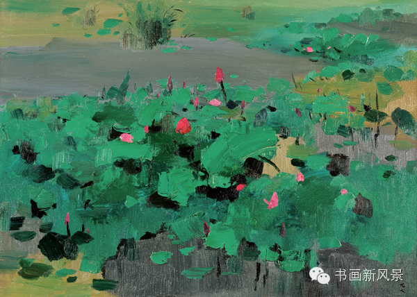 《接天莲叶胜于碧》是吴冠中画于1990年的一件画荷佳作,吴冠中在构图上这种善于在平面分割中拉大差距、增强对比的特色,说这种构图能给人以“强烈、紧张、严肃、惊险及激动。”荷花底下有很多的苔、草,那种光的反映、色彩的关系,非常丰富。他画荷花,大部分都是高贵,是一种精神,一种心灵的状态,画家爱画荷花,爱其“出于污泥而不染”,这是一种内在的高贵,没有献媚,没有奉迎,干干净净,活自己的人生。看似平淡,却是一种难以企及的境界。吴冠中的“调和中西”的艺术思想已经确立了新的艺术价值观。