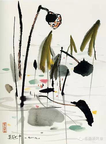 吴冠中:具象的荷塘里毕竟是紊乱的,她只予人以点、线、块面组合间抽象美的启示。正如树叶的飘落启示了舞蹈家,残荷则启示了画家。