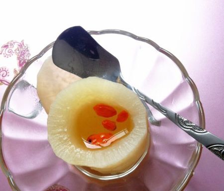 做法:用新上市的白萝卜一个,要圆圆的、大肚子的那种。把萝卜洗净,擦干水,在萝卜的上部1/3处横切一刀,上部放在一边,用小刀把下部中心掏空,注意留1厘米左右的边,在空洞中放入冰糖。再把萝卜上部盖好,周边用牙签固定好,把萝卜放入密封罐,放入冰箱保存。