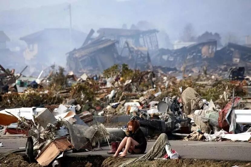 一位在2011年日本东北海啸中失去家园的女性坐在瓦砾中哭泣。
