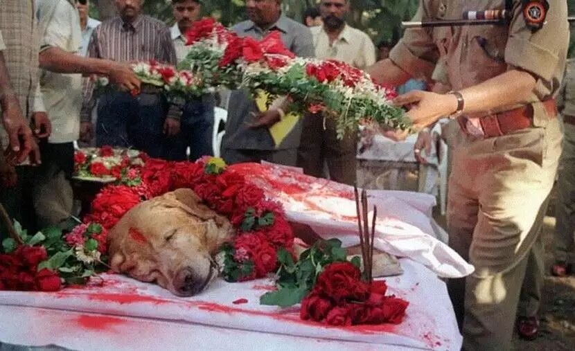 图中狗名叫Zanjeer,它曾在过去多次检测中找出3329公斤炸药、600枚雷管,249枚手榴弹,6406发实弹,拯救成千上万人的生命,并于2000年死后获风光大葬。