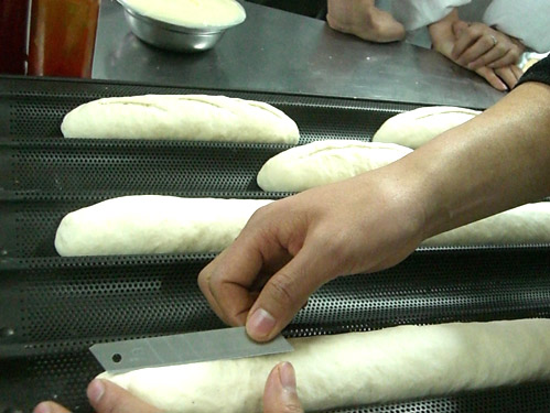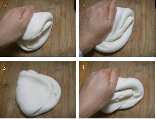 揉。是使用最多、最基本的方法。主要依靠手臂与手腕之力,用力适当。按面团不同性质,采用不同的揉法。劲力较大或质较硬的面团,一般用双手掌根交替向向前推揉,面团揉长迭起起来再揉,至面团揉透、光洁为止;大快的发酵膨松面团,一般用双手交叉向两侧推摊,然后由前向后卷迭起,翻身接口向上,双手拖住面团左侧一头,向身边拉过,在重复用前述方法揉至均匀;小块的发酵或质软面团,一般用左手按住面团一头,右手五指张开,以掌根将面团向前推摊,再随手卷拢,左手将面团翻身,接口向上,继续用前述方法反复揉至均匀。