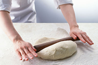 根据各类面点制品的性质和要求,?#092;用不同的技法,调制出符合要求的面团的过程。是面点制作工艺的工序之一,包括和面、揉面。调制时,冷水面团采用捣(捶、压)、揣(扎)、摔及反复搓揉等手法,使面团吃水均匀,光滑柔润;热水面团采用边和、边搅、边搓,搓捏面团的方法,或一般不揉、少揉,以防止产生筋性,失去糯柔的特点;发酵膨松面团揉面要灵活?#092;用腕力,不能用劲过大,揉匀揉透即可,加碱时用揣的手法,保证碱水均匀;油酥面团的干油酥调制采用擦法,使油、面很好地结合成团,不可用揉法,水油面调制则用揉法;其它面团多采用搅、和、揉、搓等法。面团量大可借用机器等调制。