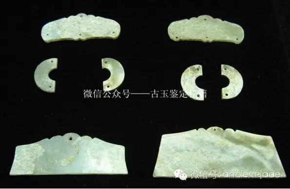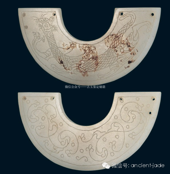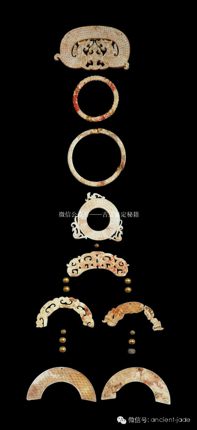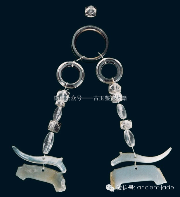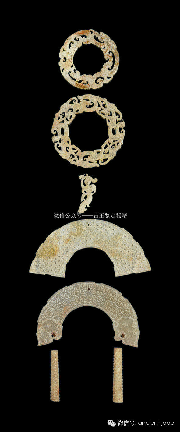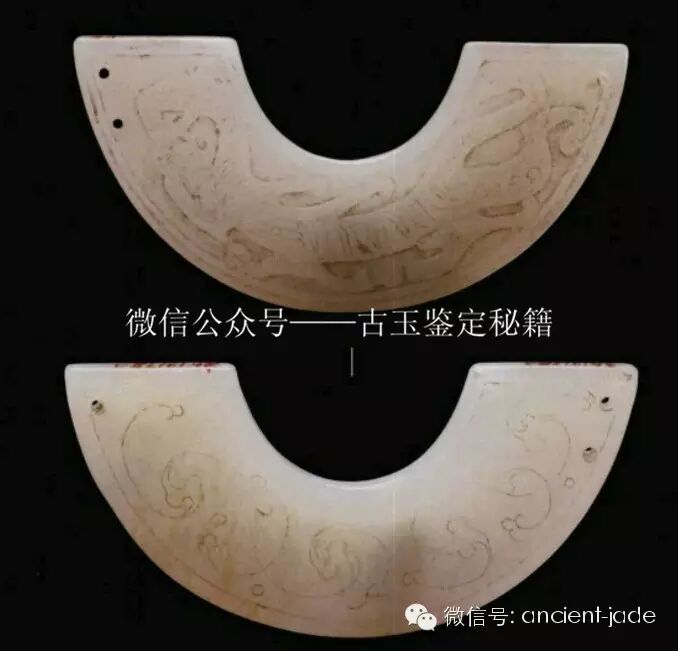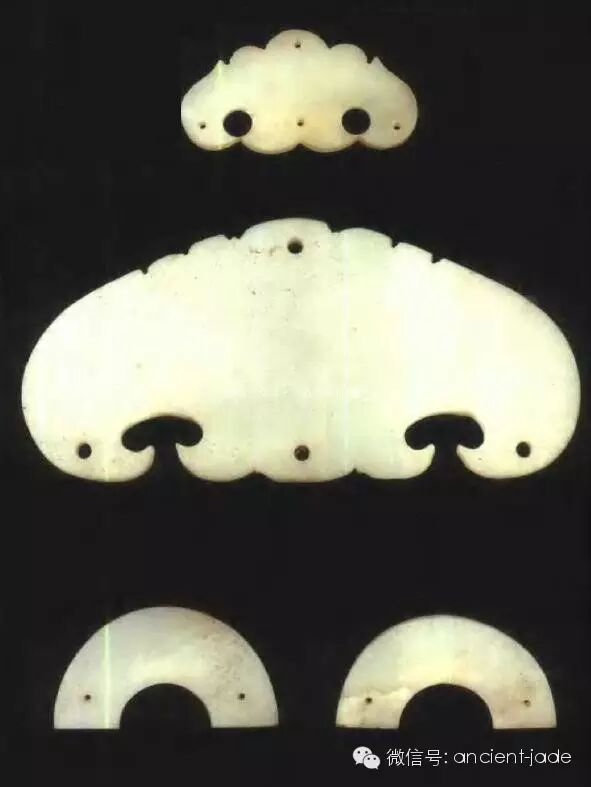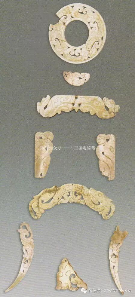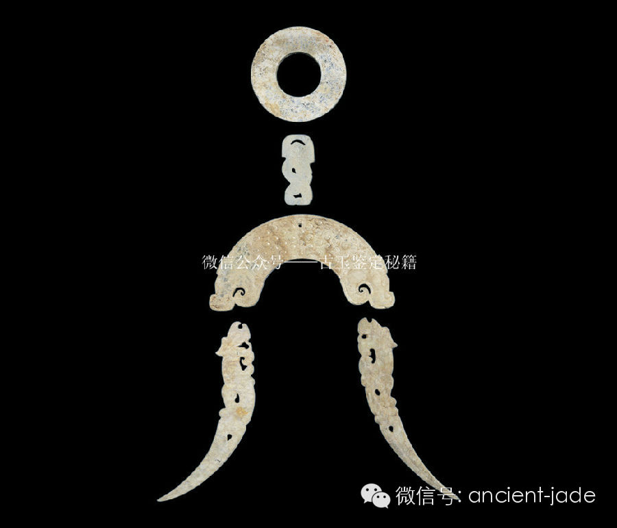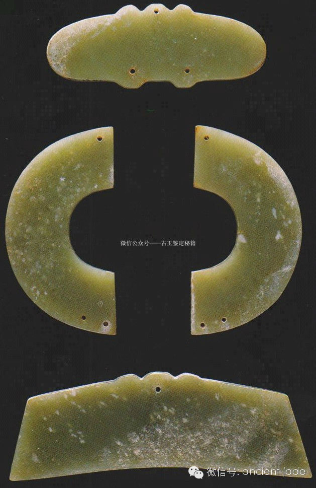 组玉佩中的璜、珩易混淆,下面有必要进行简单分辨:《说文·玉部》释“璜”为“半璧”,西周时期组玉佩中的弧形片状玉器就是璜,在佩戴时通常两端翘起,从而凹面向上、凸面朝下。春秋晚期以来的弧形片状玉器,同前期璜的形制极其接近,但其大多于中脊处钻有一孔,串缀于组玉佩中则凸面向上两端下垂,恰作磬形。根据《国语·晋语二》韦昭注曰“珩形似磬而小”;以及清代学者孙诒让注《周礼·天官·天府》所记:“衡(通珩),上隆而下窐,与横磬略相同”,可知这些佩戴起来凸面向上的璜形玉实为珩。
