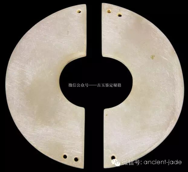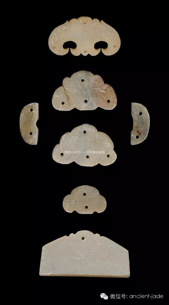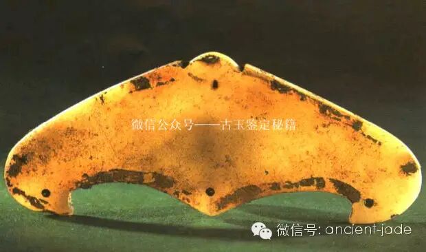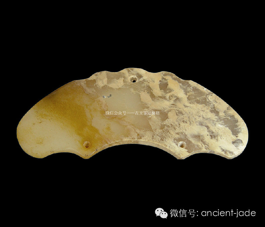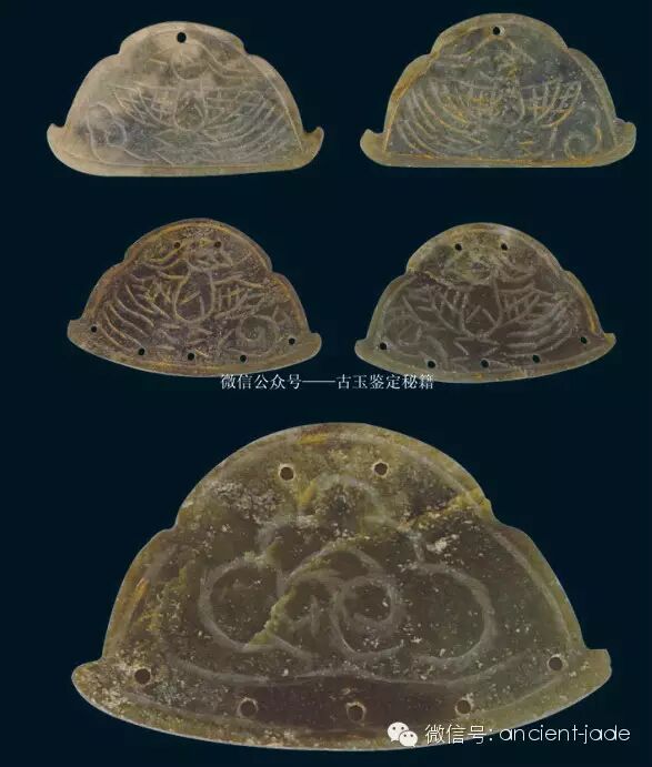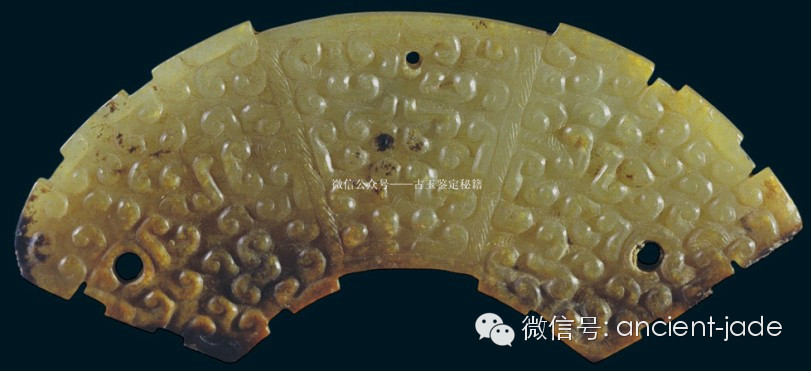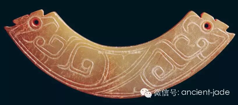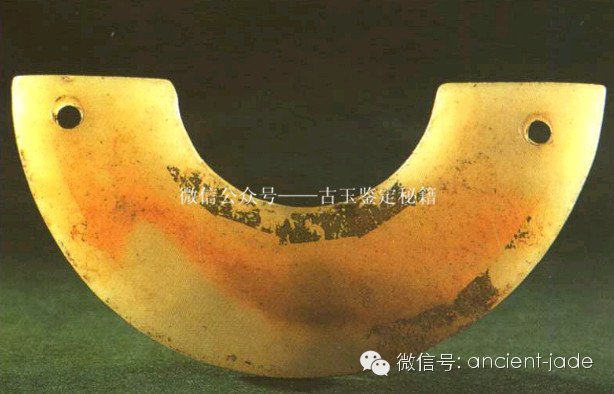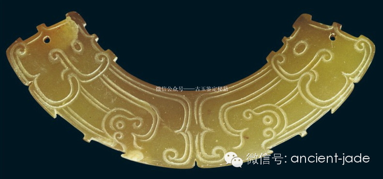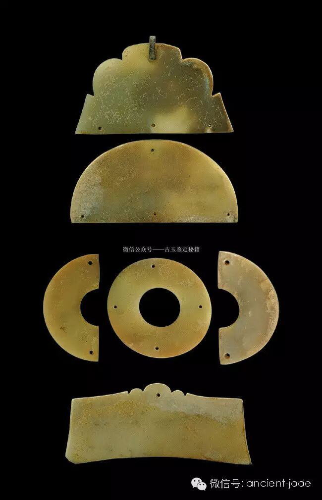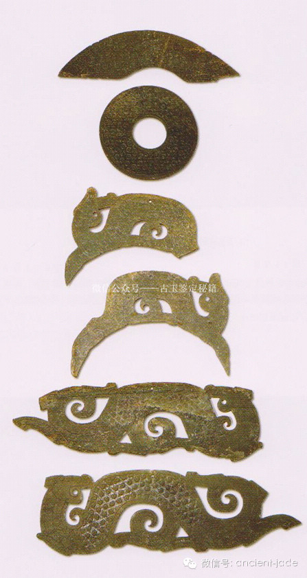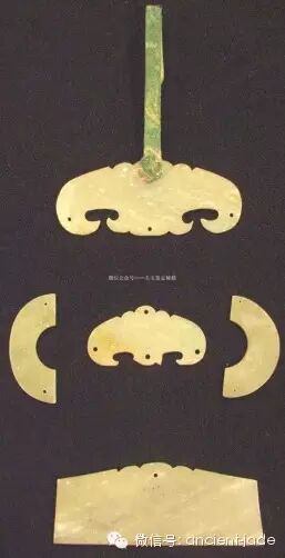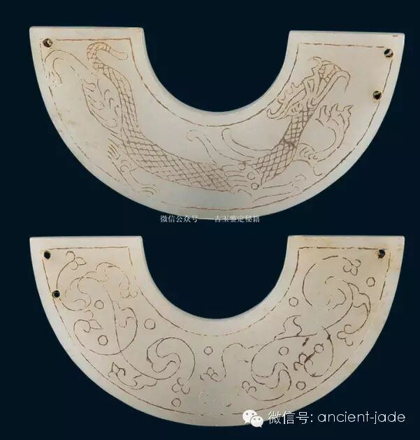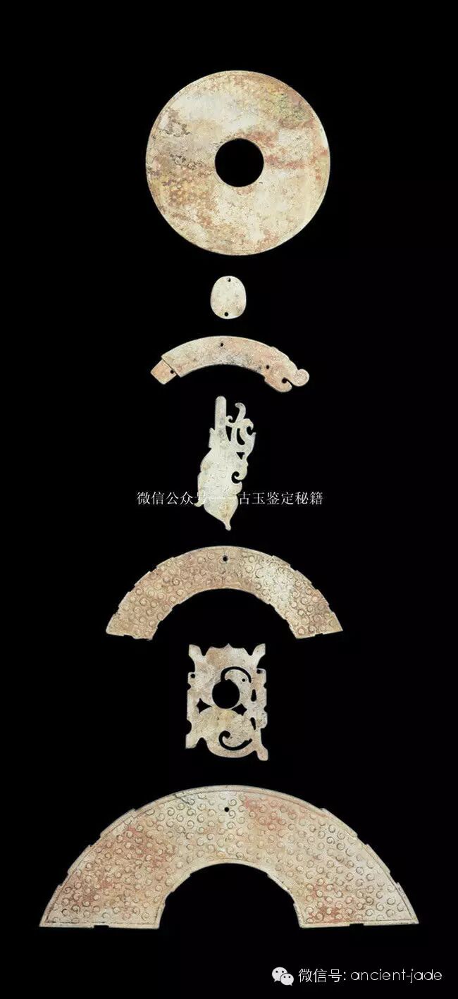 组玉佩中的璜、珩易混淆,下面有必要进行简单分辨:《说文·玉部》释“璜”为“半璧”,西周时期组玉佩中的弧形片状玉器就是璜,在佩戴时通常两端翘起,从而凹面向上、凸面朝下。春秋晚期以来的弧形片状玉器,同前期璜的形制极其接近,但其大多于中脊处钻有一孔,串缀于组玉佩中则凸面向上两端下垂,恰作磬形。根据《国语·晋语二》韦昭注曰“珩形似磬而小”;以及清代学者孙诒让注《周礼·天官·天府》所记:“衡(通珩),上隆而下窐,与横磬略相同”,可知这些佩戴起来凸面向上的璜形玉实为珩。