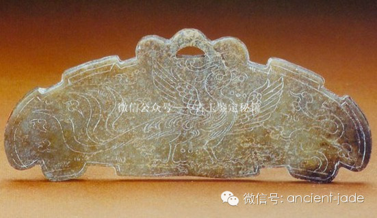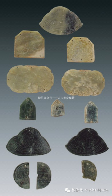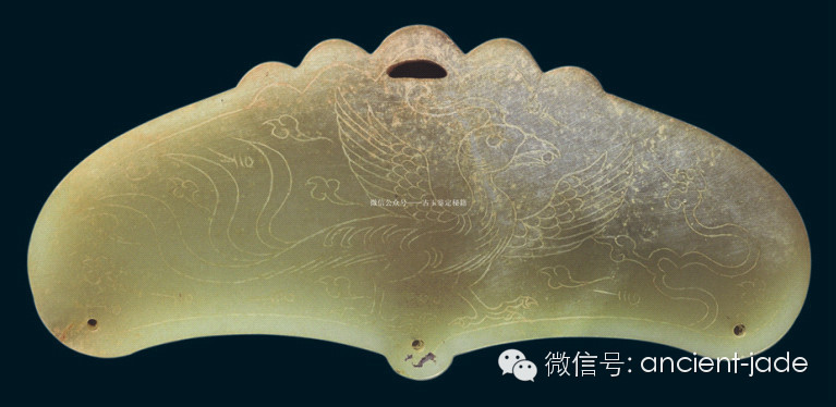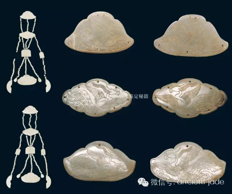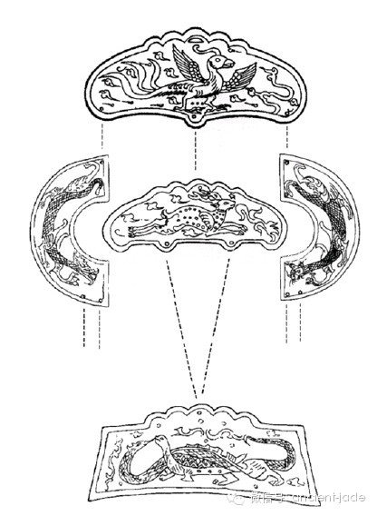 两期差异之处主要体现在珩的形制上:魏晋南北朝时期玉珩为云头形(或飞碟形),珩下缘为二到四个弧凸,形态简单;而唐代时期的珩多呈蝙蝠状,珩下部为蝙蝠翅尖及尾翼,较之前明显复杂,且尖角勾饰更锋利明显。此外魏晋南北朝玉佩表面所见纹饰皆为四灵图案,而唐代多作龙凤纹样。