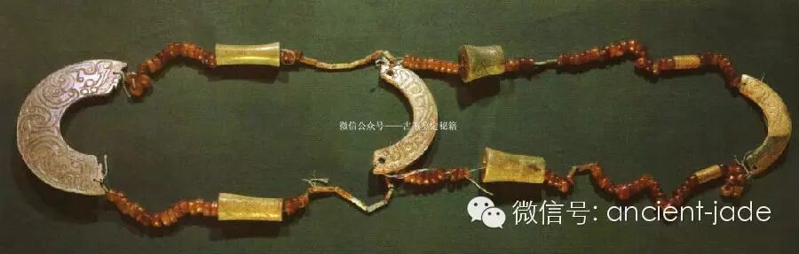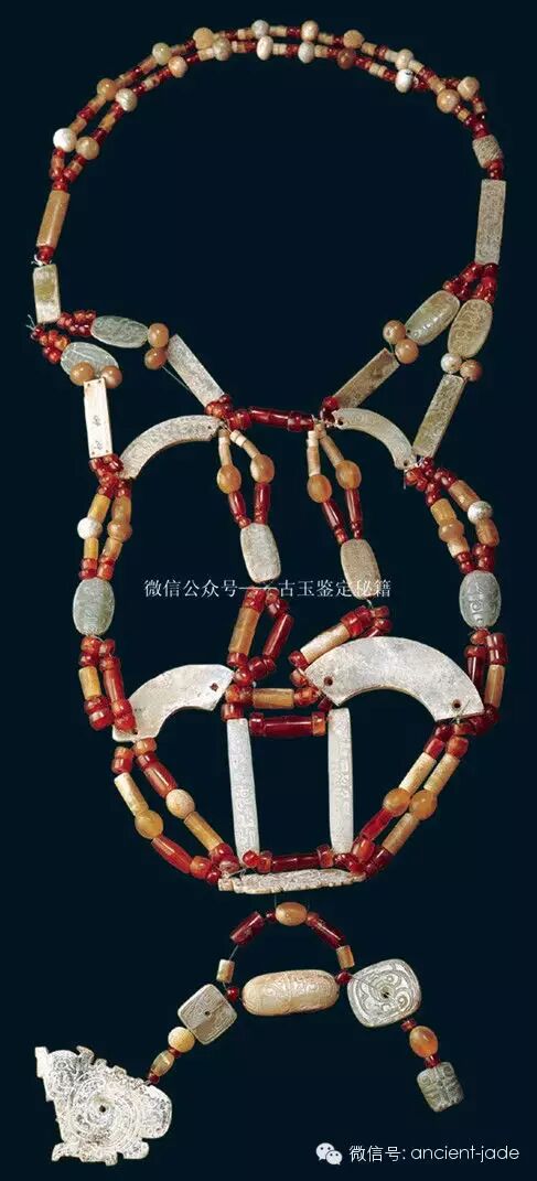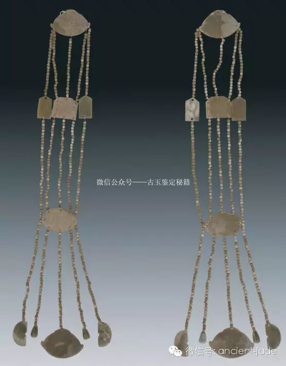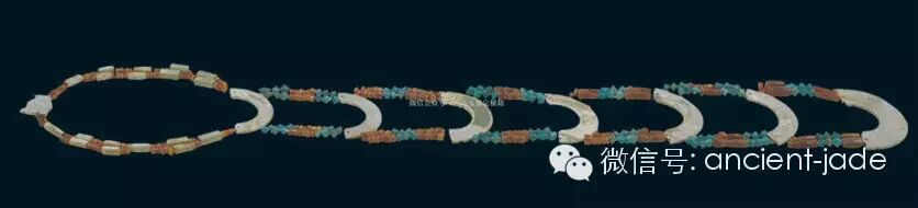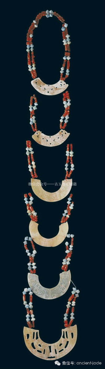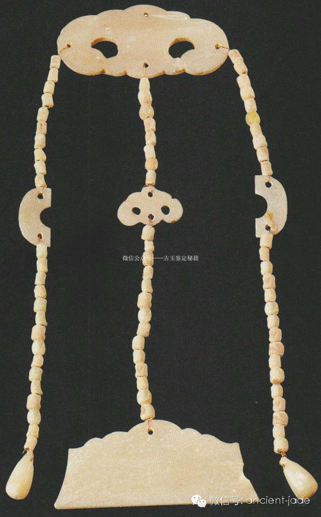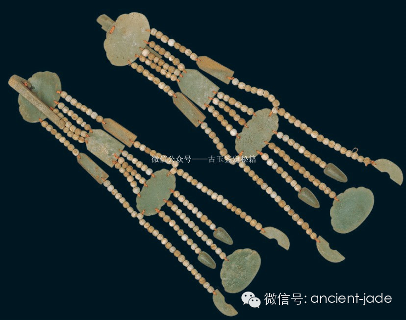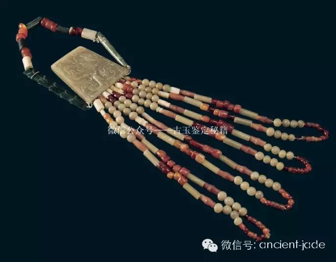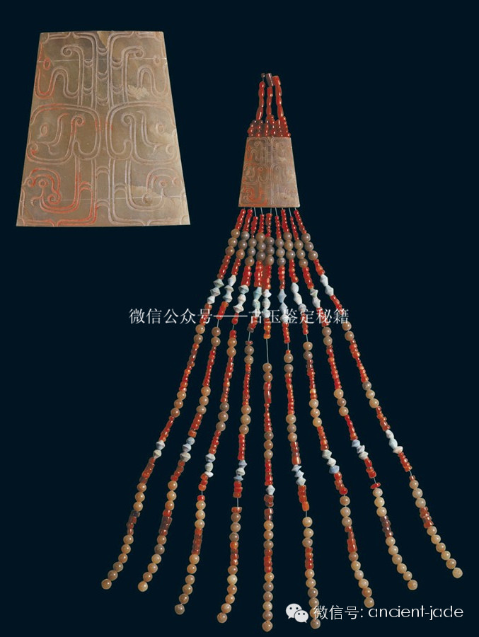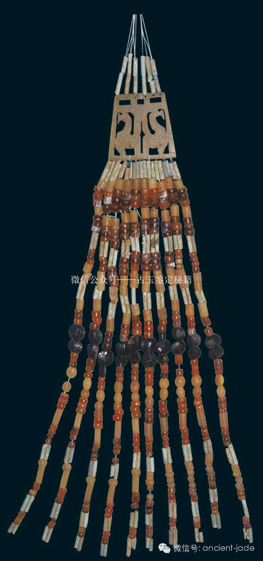 其二,玉牌联珠组玉佩。即用玛瑙珠、玉珠、料珠等物串成若干股,然后将之总束于一件梯形玉牌、骨牌或象牙牌之下缘;有的珠之间也可能夹杂玉戈、玉蚕蛹等小型玉饰件。此类仅流行于西周晚期。