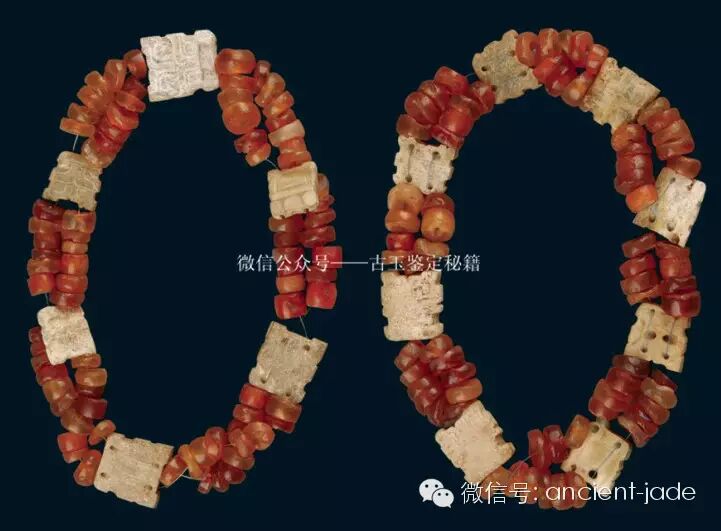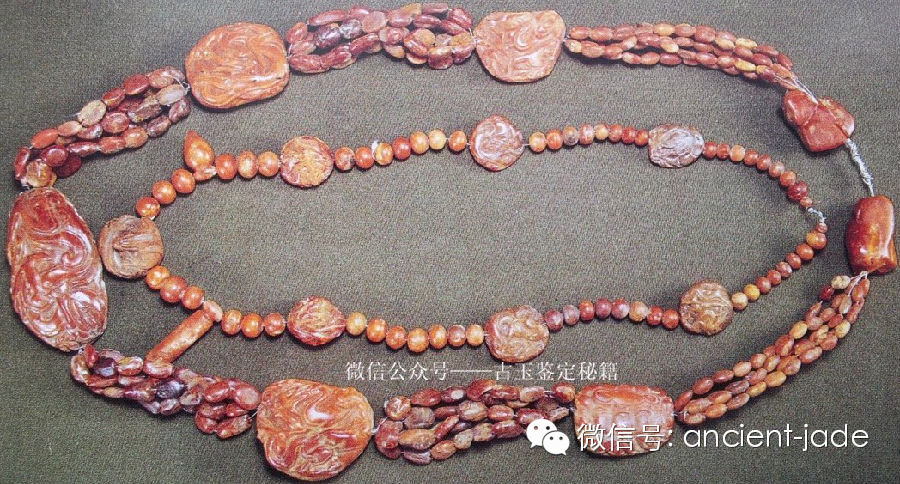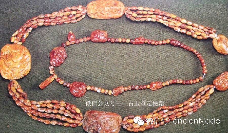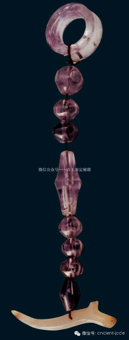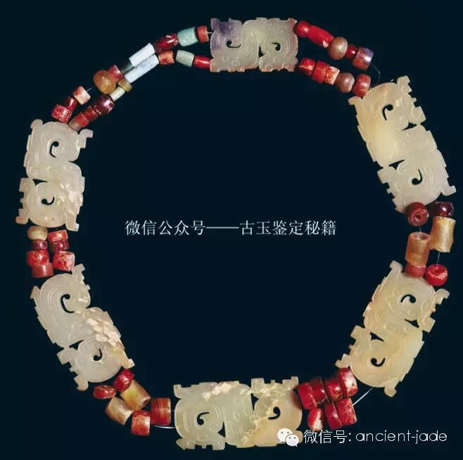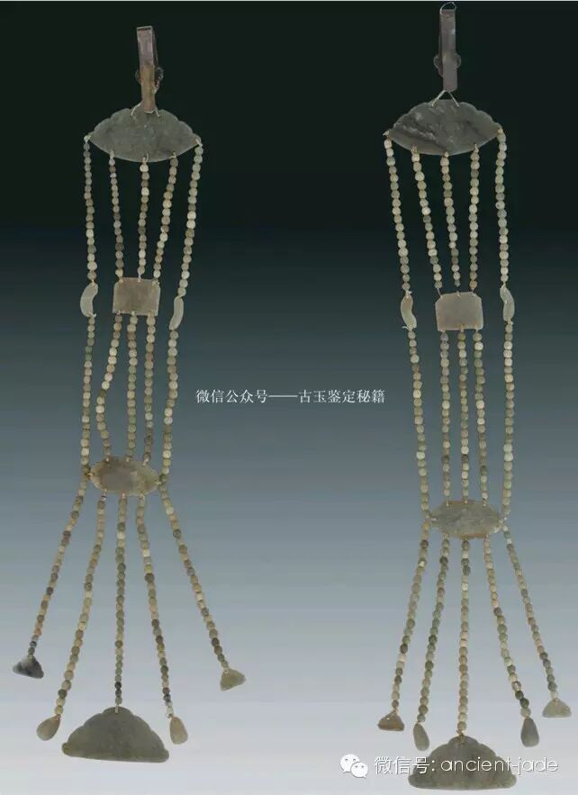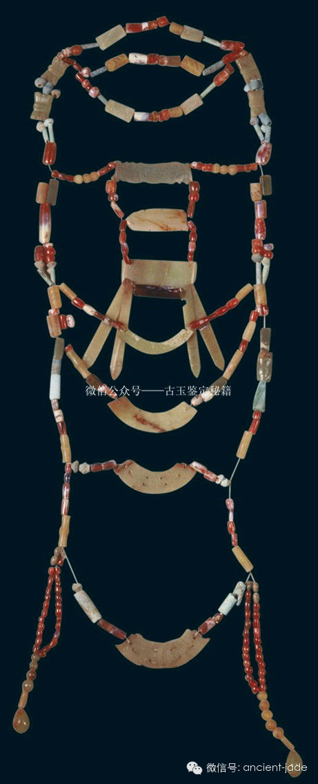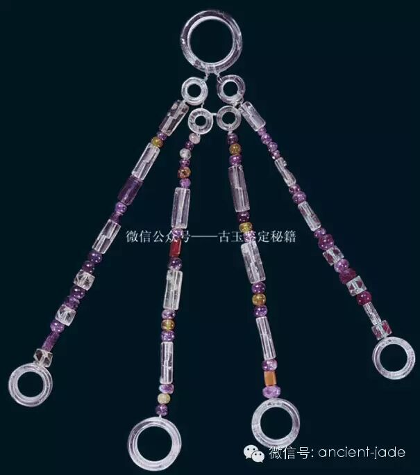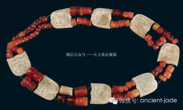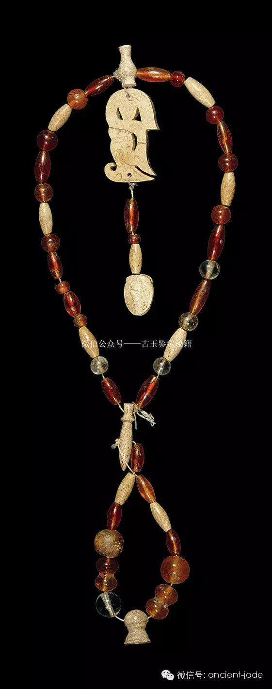其二,玉牌联珠组玉佩。即用玛瑙珠、玉珠、料珠等物串成若干股,然后将之总束于一件梯形玉牌、骨牌或象牙牌之下缘;有的珠之间也可能夹杂玉戈、玉蚕蛹等小型玉饰件。此类仅流行于西周晚期。