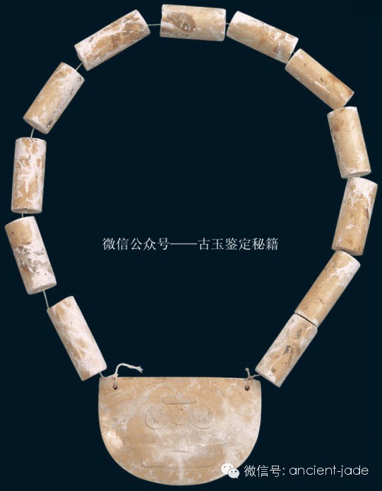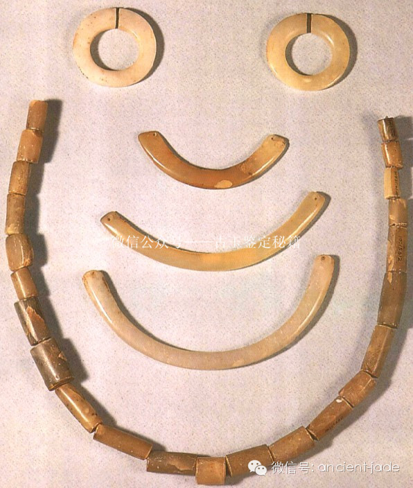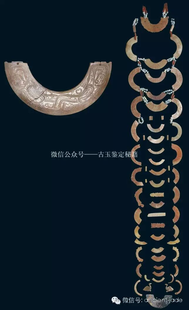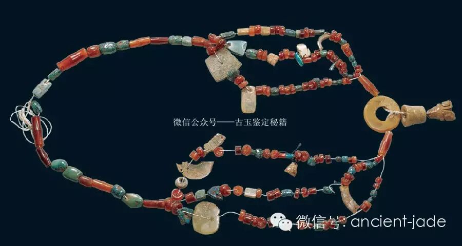 新石器时代尚未见到严格意义上的组玉佩,但是新石器时代中期的北阴阳营文化、新石器时代晚期的良渚文化皆已出现了由玉璜(玉牌饰)、管状珠组合而成的玉项饰,其中玉璜通常被串连在玉佩中部的显著位置上,以充当组合的主体。此期佩戴玉项饰应主要为了装饰及象征财富、权力之用,尚未具备礼制方面的作用。从形制上看,西周时期的组玉佩很可能正是在这类玉项饰的基础上发展而成的,不过周代的和新石器时代玉佩之间的承袭关系目前还无法明确,因为在商代遗存中尚未发现可以作为其过渡环节的资料。
