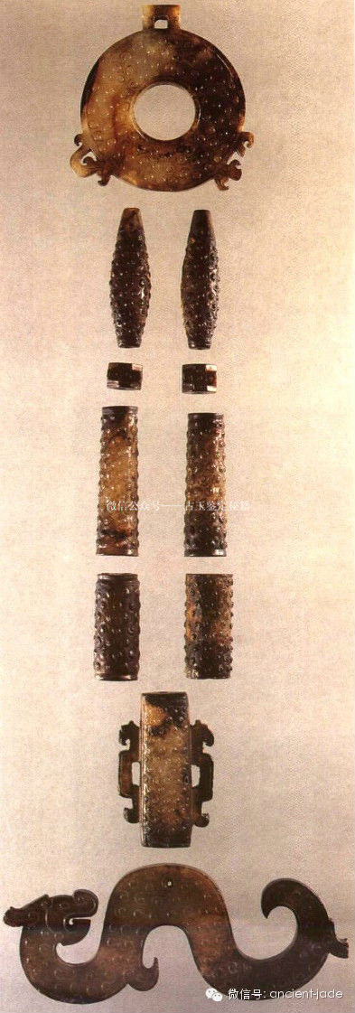 春秋晚期以降,组玉佩的佩戴方式及形制都发生了巨大的变化,这和东周时旧制度逐步瓦解、“礼崩乐坏”的历史潮流是合拍的。在佩戴方式上,此期组玉佩均不再套于颈部,而是系在腰间的革带,并垂至下肢。在形制上,构件中的玉璜被珩类器所替代,且新增加了玉璧、玉环、玉管等器类。