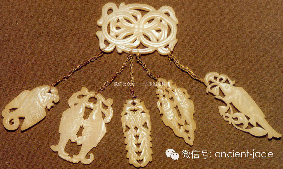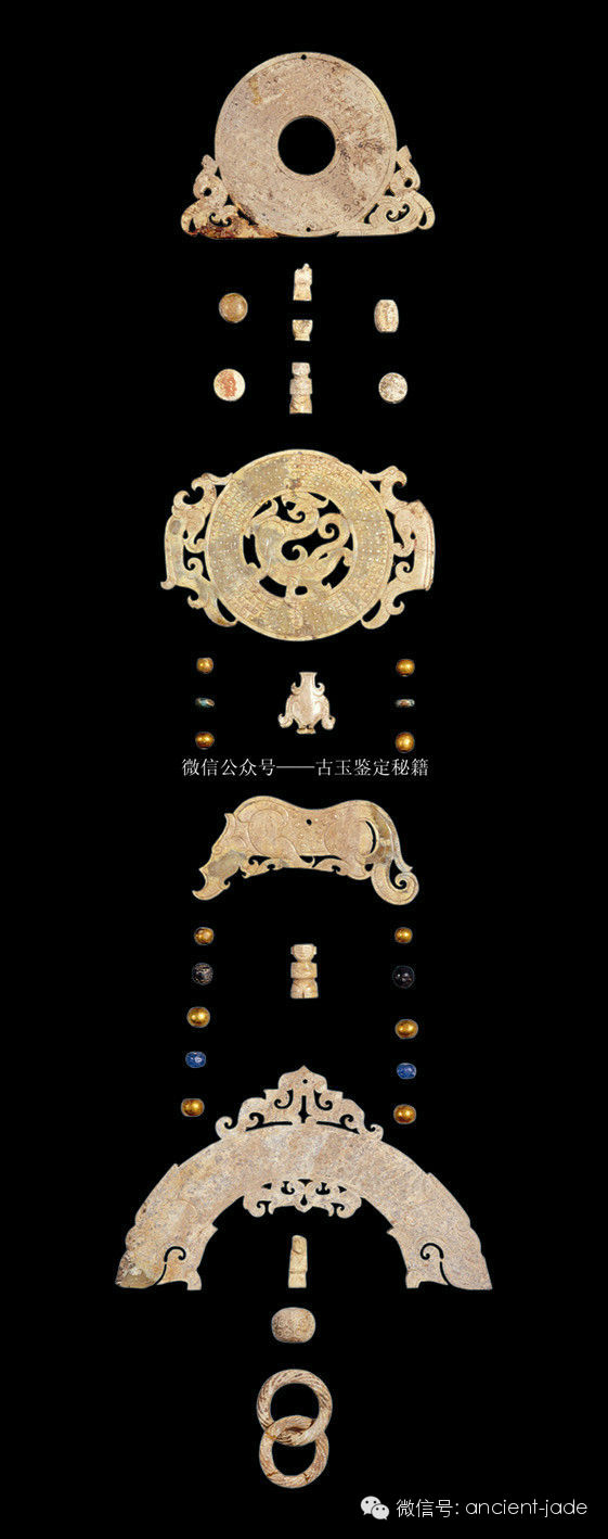 魏晋南北朝的组玉佩,改变了以往的风格,其构件形制、组合都与汉代有明显区别。汉代组玉佩不拘一格,结构尚无定制,形式复杂多样,而魏晋南北朝时期则大体依一种统一的模式,结构简单,更加规范和制度化。