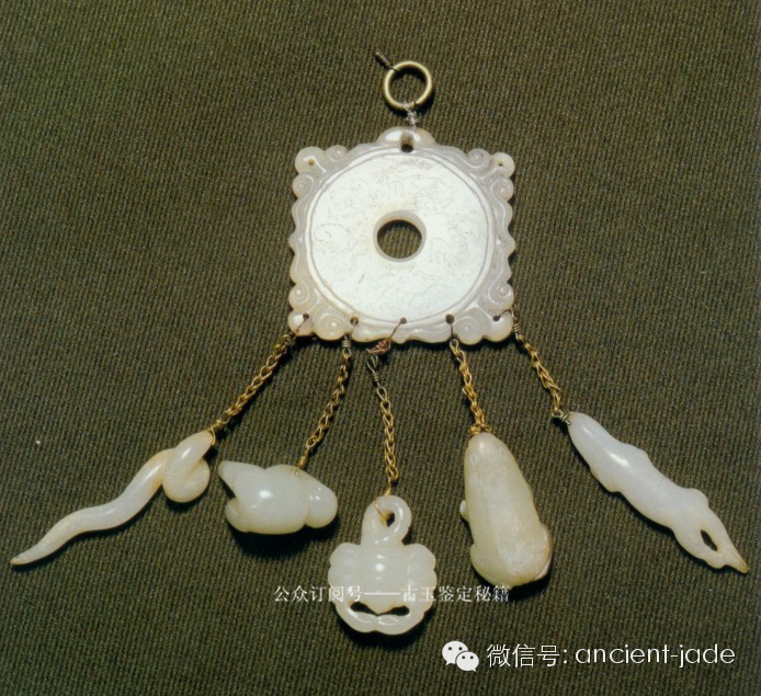 此期组玉佩多由云头形、蝙蝠形玉珩,竖置的玉璜,磬形玉冲及玉珠组成;常见的组合形式:通常置一玉珩于顶端起提梁之用,其下中央系一到两件玉珩,两旁各为一竖立玉璜,底端中央为一玉冲,两侧各垂一玉珠。此期一扫战汉时期华丽的装饰之风,大多素面无纹,少量以单阴线刻饰纹样。