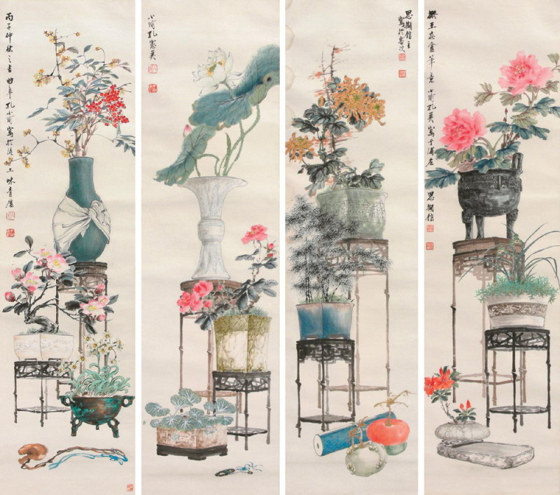 孔小瑜 1926年作 四季博古花卉 四屏