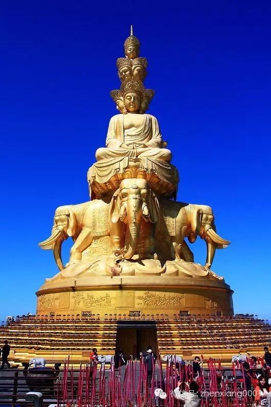 四川峨眉山金顶的四面十方普贤金像,是世界上最高的金佛,也是第一个十方普贤的艺术造型。金佛系铜铸镏金工艺佛像造像。金佛通高48米,代表的是阿弥陀佛的48个愿望。“十方”,一是意喻普贤的十大行愿,二是象征佛教中的十个方位。如果说公元980年安坐于万年寺高7.85米的普贤铜像作为峨眉山千年的镇山之宝,为这座佛教名山增辉千年的话,那么,高达48米的十方普贤金像,更是登峰造极之作。2005年底竣工,2006年6月18日举行开光仪式。