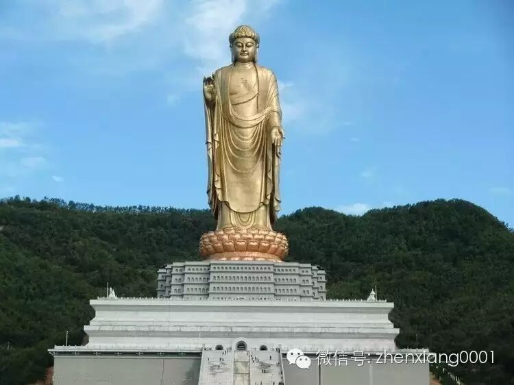 河南鲁山大佛,卢舍那佛立像,青铜材料,通高168米,相当于50层楼高,重6400吨,公元2005年建成。 位于河南省平顶山市鲁山县上汤赵村佛泉寺内,总高168米(大佛身高108米,莲花宝座高20米,金刚座高25米,须弥座高15米),是全世界最大的佛像,称为“佛山金佛”。其造型庄严飘逸、气势独特,真乃“当惊世界殊”。造型完整、有明确的说法手印的铜铸“佛山金佛”应运而生,成为新的中方佛。