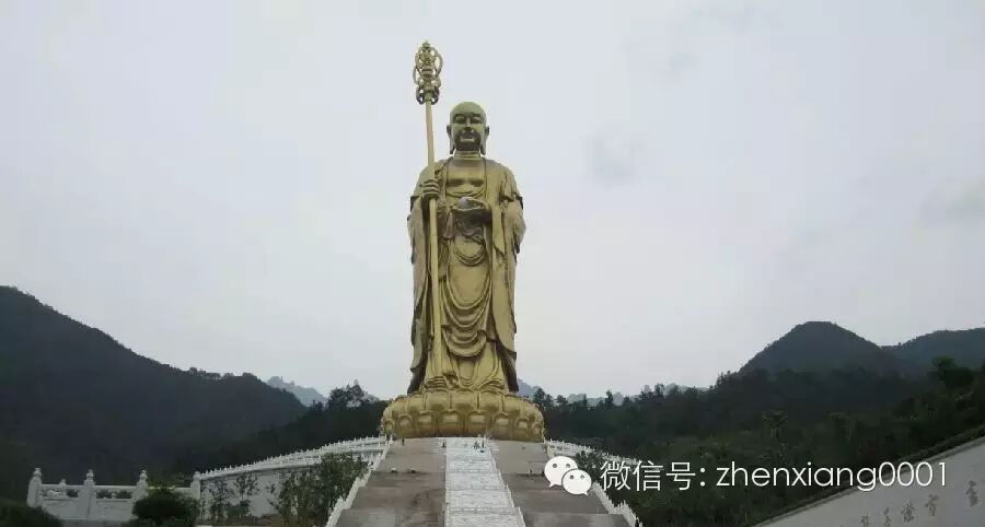 安徽九华山地藏菩萨露天大铜像,位于安徽池州市九华山下柯村景区,为比丘立相,右手执锡杖,左手托摩尼宝珠,仪态安详,妙相庄严。铜像气势恢弘,高达99米,与九华山99座山峰、金地藏享年99岁的寓意相一致。铜像采用铸造方式,选用仿金铜,2003年11月13日开工,到2009年3月铜像主体结构完工,2013年9月1日开光。