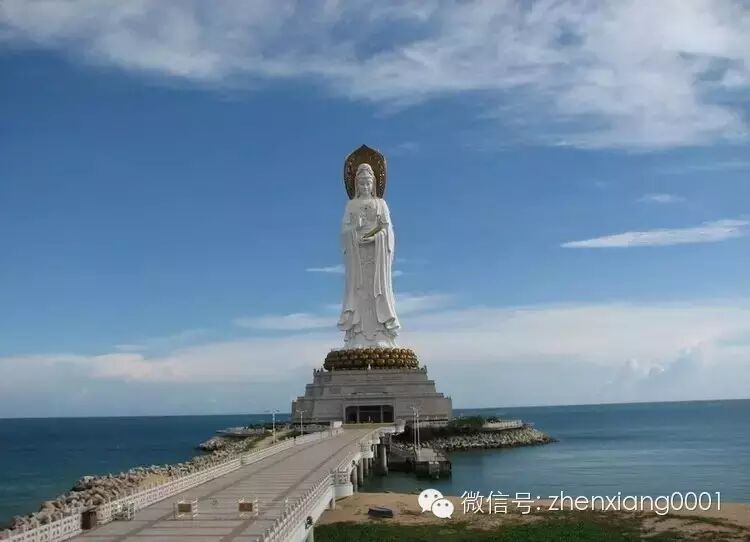 海南三亚南海海上观音像,钢筋混凝土材料,高达108米,比美国的自由女神像还要高15米。2005年4月24日举行开光大典。像体为正观音的一体化三尊造型,宝相庄严,脚踏108瓣莲花宝座,宝座下为金刚台,金刚台内是面积达15000平方米的圆通宝殿。南海观音像通过高科技手法,组合运用声、光、电技术,进行大型灯光夜景演示,充分展示了“佛光普照”的效果。