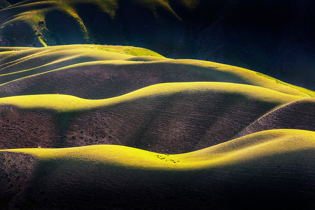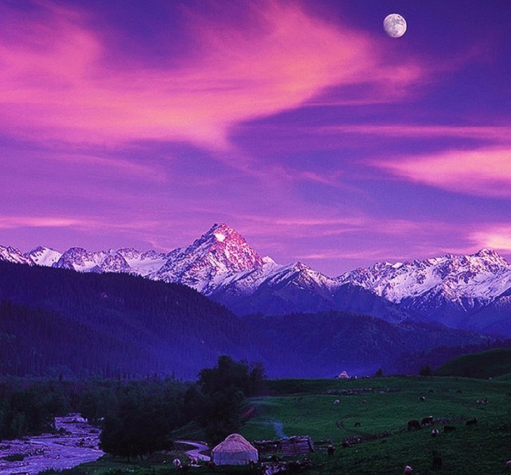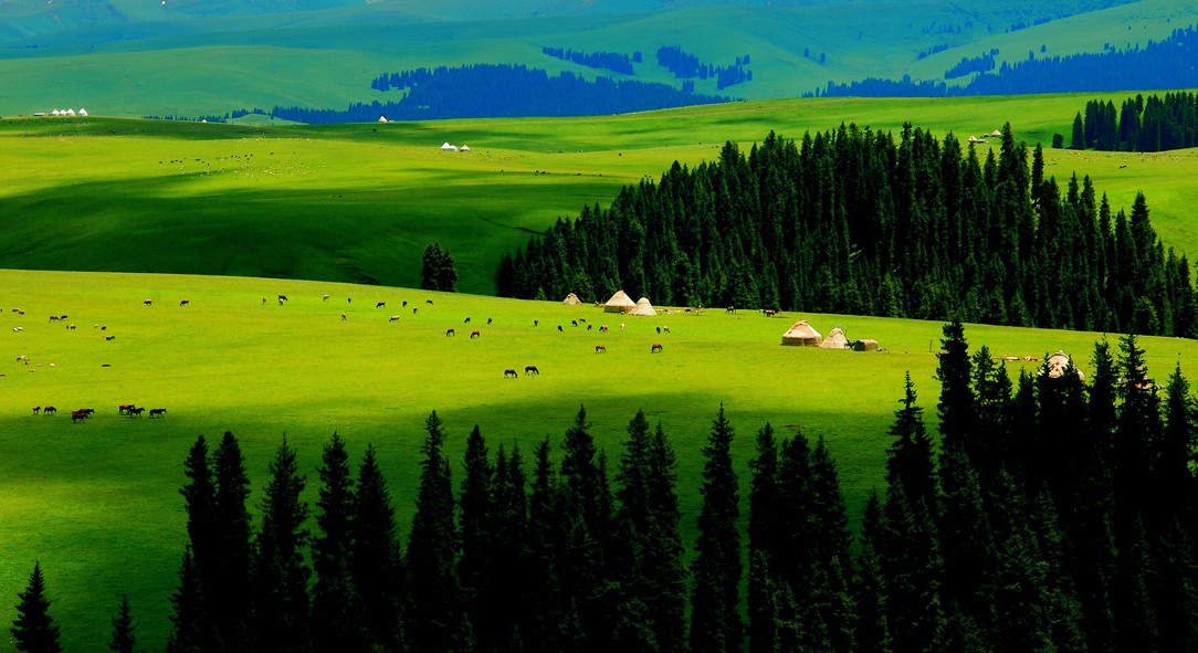 夏草如茵,漫漫的铺满到视线的尽头,舒缓的线条绵绵不绝得的与雪山相连,哈萨克的毡房犹如草原上滋生的白色蘑菇,成群的牛羊悠然自得“咩咩”散步。这是一幅多么美仑美幻的高山草原图画。