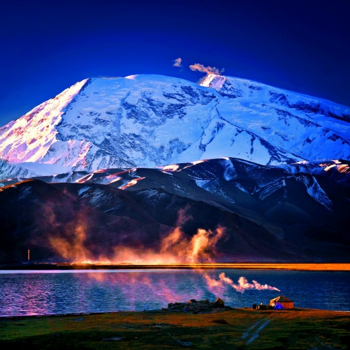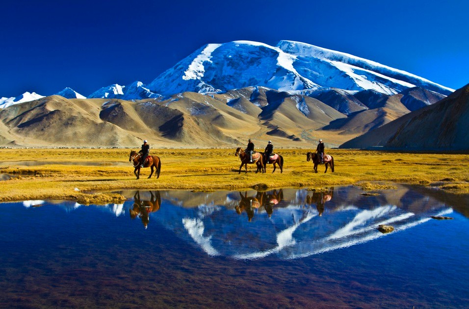 此外,慕士塔格山和脚下的卡拉库里湖仿佛天作之合,天空如洗,湖水如镜,倒映着慕士塔格山、公格尔山以及公格尔九别山这一连串的雪山,直让人感叹:此景只应天上有。