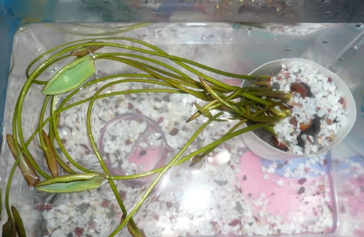 移栽时将小荷苗按入泥中,每盆栽一株,移栽后加适量水,以水不淹没小荷叶为度。待长出7~13片浮叶后即可出现立叶。一般来说,多花品种,在长出5~17片立叶后可始现花蕾。现蕾早晚,视品种而异,有的品种在立叶长出之前就现蕾开花。