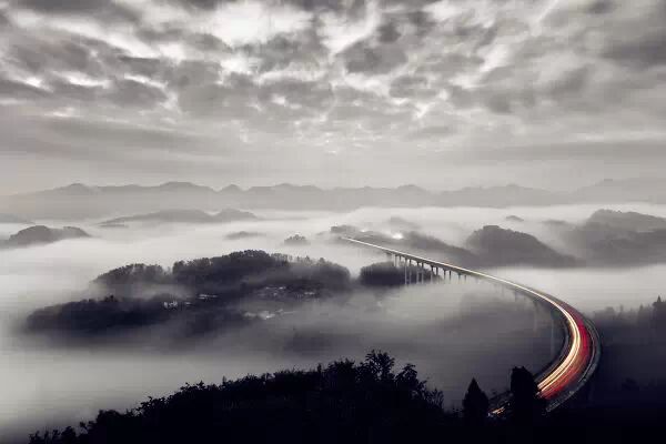 网友说,看着照片就像是人在天上,车在桥上,我在梦里。像是通向仙影的道路……