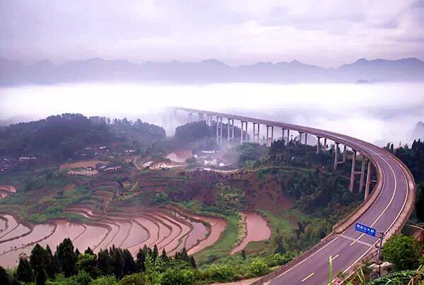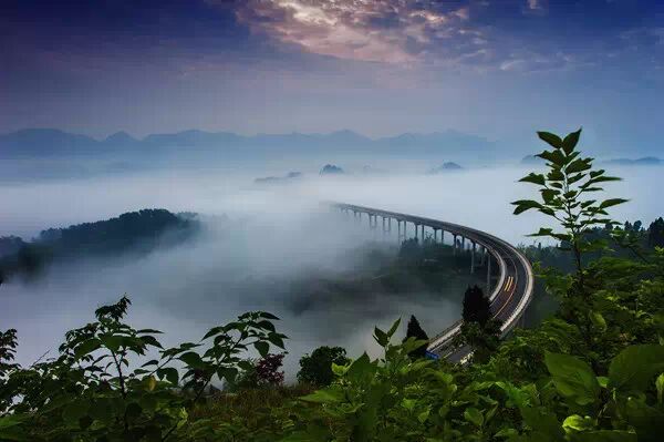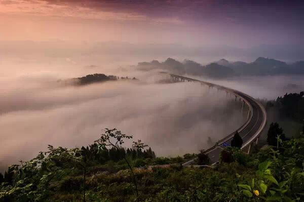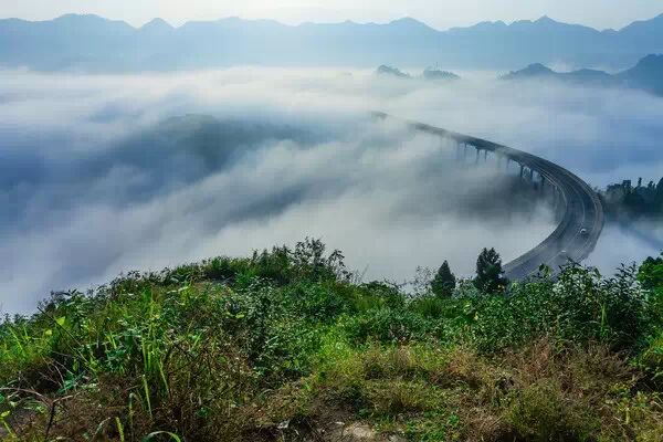 雾纱时开时闭,大面积的云海和云雾将山谷丘陵地带、大桥打扮如仙境一般,美丽迷人,是当地最迷人的景观风景线之一。