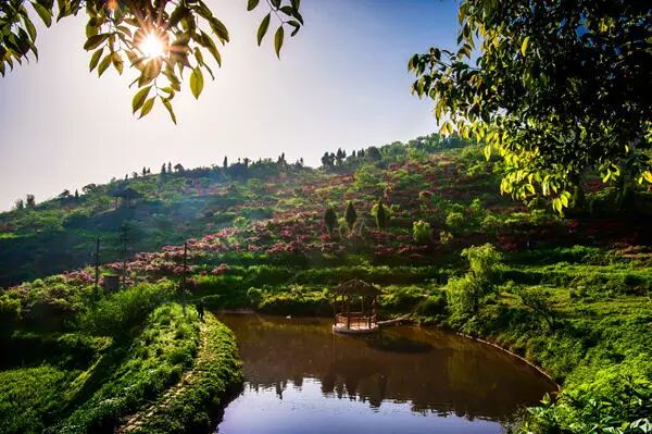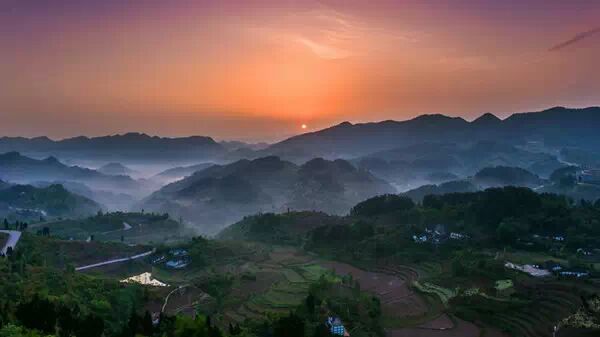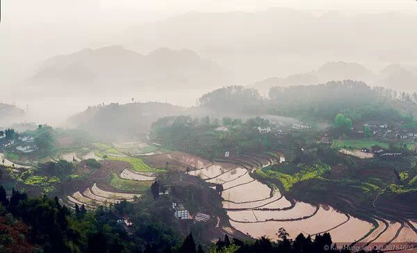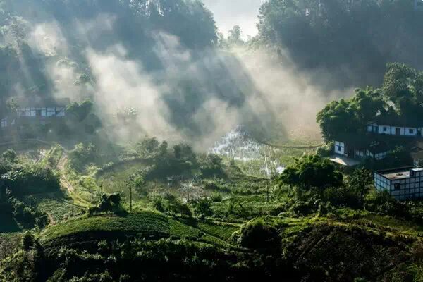 阳光透过云层,丝丝漏在了田野、树林、村子,宁静祥和,田园风光诱人。