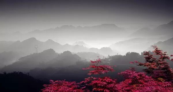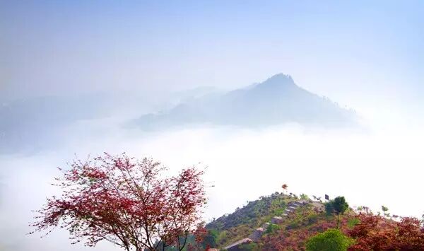 浓雾的时候,它若隐若现,在红枫的衬托下,虚虚实实,分不清楚