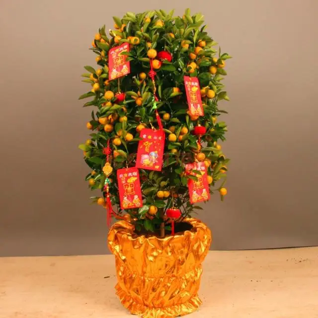 桔为吉,金为财,金桔也就有了吉祥招财的含意。金桔树可以摆在家中,也可以作为贺礼,在拜年用的果篮里放上一些金桔,是很好的祝福方式。需要注意的是,选购盆桔时一定要挑选果满(因果疏有“凶多吉小”之意)、果色要红润、枝叶要碧绿不要有黄叶。