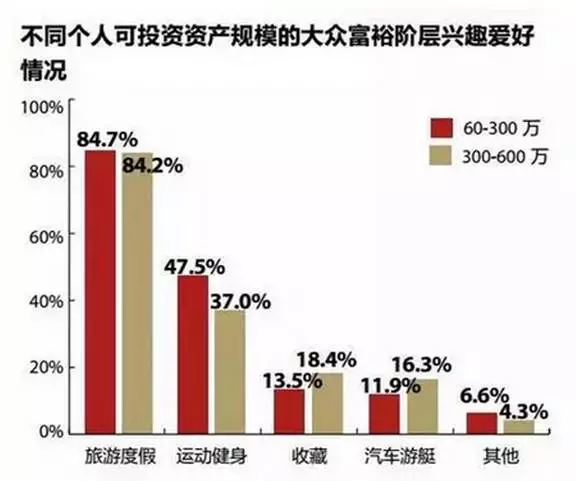 身处竞争激烈的社会,很多人开始将个人爱好发展成为排解压力的有效途径之一,经济条件良好的大众富裕阶层也不例外,旅游度假、运动健身是他们最主要的兴趣爱好;其次,汽车游艇更受年轻群体的青睐,而收藏则在年长群体中更为普及。