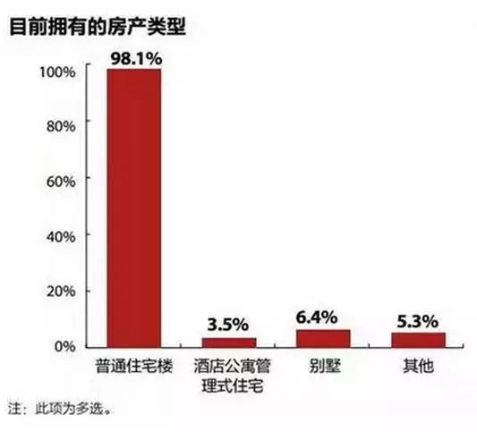 在调查的大众富裕阶层中,有95.1%表示拥有自己的住房。在房产类型上,98.1%的人拥有普通住宅楼,只有6.4%的人拥有别墅,3.5%的人拥有酒店公寓管理式住宅。可见,大众富裕阶层更青睐购买普通住宅楼。因为独具投资慧眼的他们认为,从投资房地产的角度来看,普通住宅楼也相对最容易变现。