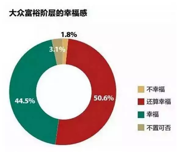 看到了吧,大众富裕阶层普遍感到“幸福”和“比较幸福”,明确表示“不幸福”的仅占到1.8%。健康、财富、事业成为影响他们幸福的最重要因素,个人可投资资产越多,压力感就越小。
