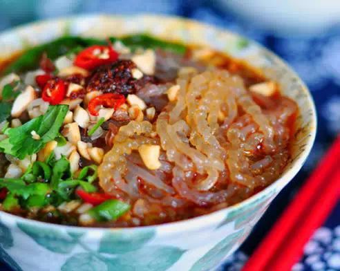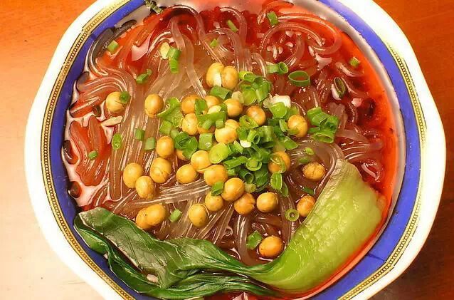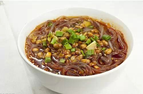 8、红薯粉垫点,浇上酸辣汤,撒上熟芝麻,炸花生,青菜,香菜末即可。