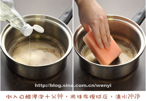 2)将白醋倒入锅中(别在白醋里兑水),没过水碱或糊痕,静置一段时间,具体时间嘛,要看您家的锅被糟蹋得程度了哈。 一般10---20分钟即可。