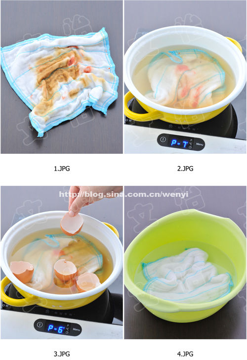 **我们每次打完鸡蛋,蛋壳的内壁上,都会残留一层蛋清,蛋清中的蛋白酶,能让抹布变白变干净,它可起了决定性的作用哦。