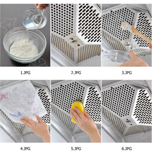 2) 然后用刷子蘸上面糊,刷在烟机的油网上,再将厨房纸巾粘在面糊上,防止面糊滴落在灶台上,也起到减少