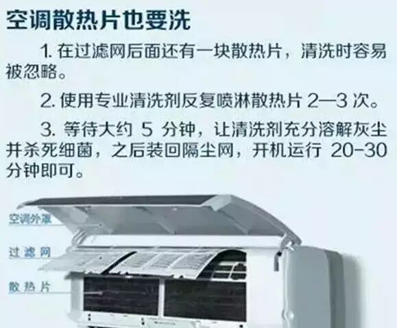 每年夏天都会有人因患上“空调肺”而不得不去看医生。因为长期不清洗空调,空调的风携带了大量细菌,会感染你的肺部。所以,空调要3个月清洗一次过滤网,1年要彻底清洗一次。