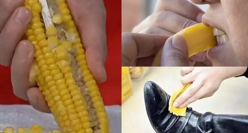 用叉子或筷子的斜面端,沿着玉米的纹路,从玉米根部往上推,就能很轻松地把玉米粒取下来。