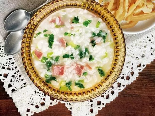 ④ 将粥煮滚后放入猪肝片、菠菜、姜丝加入盐、鸡精、胡椒粉调味放入枸杞出锅装碗淋少许香油,撒香葱沫即可。