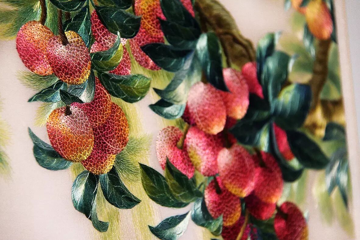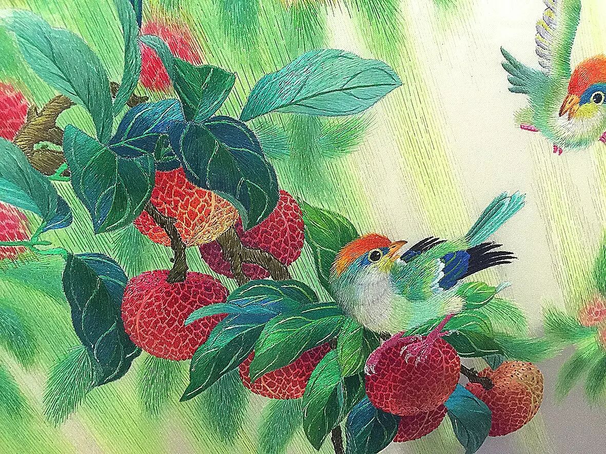 一走进鹏喜陈氏广绣工作室,我们就在四处寻找那幅陈少芳大师著名的广绣作品──岭南荔枝。那是一丛生长在南国雨后的荔枝,每一个果实都鲜嫩而饱满,它们并不都是红色的,在阳光照耀到的地方,果子甚至有些金色。叶子也并不都是绿色,远远的那些是嫩绿,近的是层层浸染的墨绿。两只毛绒绒的画眉鸟跳跃其间,回头顾盼。站在那里,你仿佛能听到红线女“卖荔枝”的歌声。