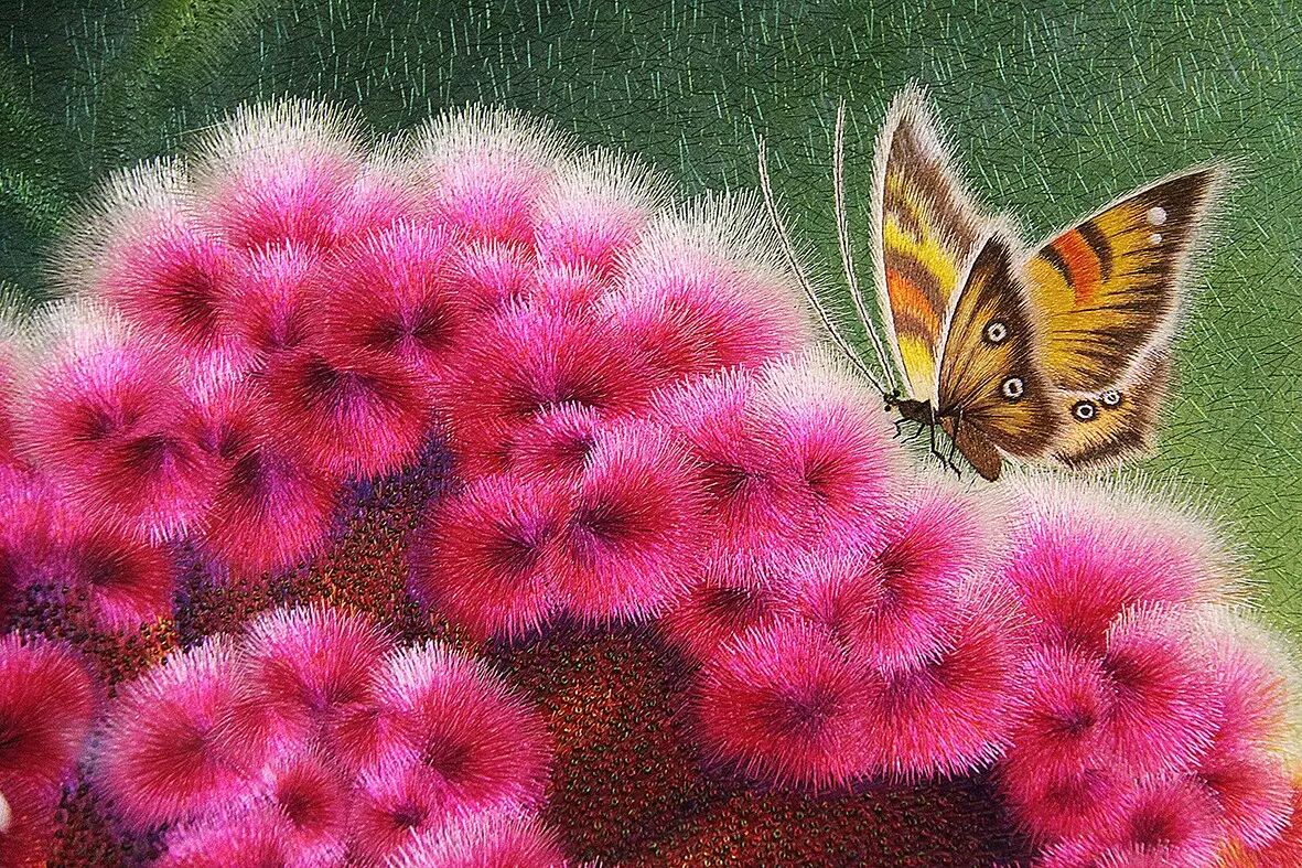 而这种灵活性还体现在另一副作品──《凤冠蝶舞》上。陈氏绣法强调的是因细则细,因粗则粗,针法的需求来自于构图的需要:扇形交叉针细细密密,才能表现花瓣表面像铺满针状毛丝的特征。而相对粗犷的绣法去处理背景和狗尾巴草,才更能体现花朵的柔弱和灵动。