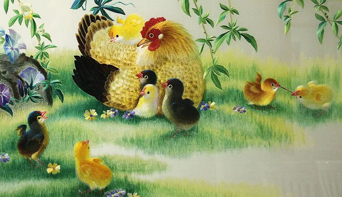 比如“绣小鸡的针法也是陈氏针法的独创,名绒毛针。以前绣的小鸡,鸡毛像是从水里捞起来的,现在绣一只小鸡,光用的针线颜色就需要二十多种,层层叠加,近看肉眼是发觉不了它纯粹的颜色,但远看它又是一个整体,一个鲜活的生命。”