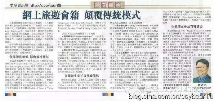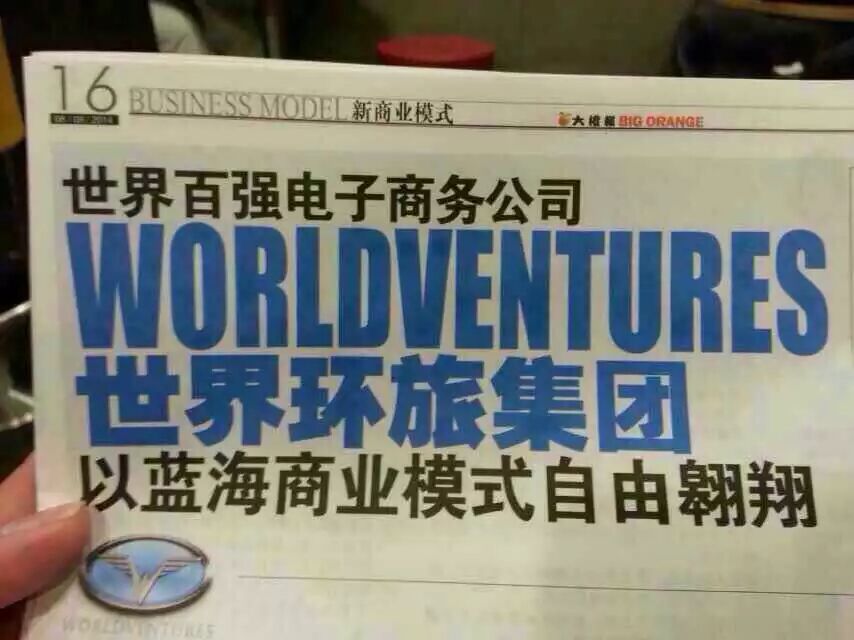 东南亚第一的中文商业周报《大橙报》对世界百强电子商务WV世界环旅集团的赞誉: 以蓝海商业模式自由翱翔,颠覆传统旅游项目,开创新的蓝海商业版图,创造新的财富大浪潮!这是一个蓄势待发的星星之火,让我们一起拭目以待!