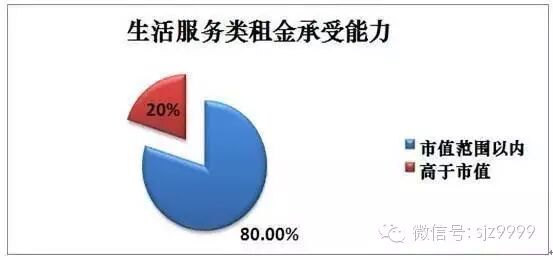 生活服务类商户中,可接受市值范围以内租金的占到80%,占总量的五分之四。而能接受高于市值租金的商户仅占20%。生活服务类商户主要以超市、便利店、生活配套服务为主。此类业态以满足消费者日常生活所需为主,主要分布在人群居住密集、生活消费频繁的区域。大部分生活服务类业态分布于大型社区底商或自发形成于社区周边的临街商业。对于生活类业态来说,他们的大多属于薄利多销类的商铺,故对于租金的承担能力会显现的比较弱。