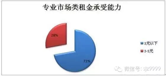 从专业市场方面来看,能承受租金为3元/平米/天以下的商户较多,占到总量的72%,能接受租金为3-5元/平米/天的商户占28%。目前,北京市专业市场主要以自发形成的临街商铺和中低档集贸市场为主,市场环境杂乱无章,产品档次普遍较低,租金水平也随之较低。专业市场已逐步由中心城区向郊区外迁,市场形态也逐步调整升级,在中心城外围地区发展成为主力商业形态。