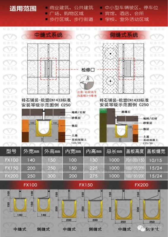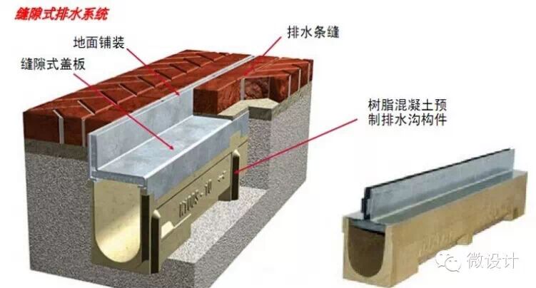 缝隙式线性排水系统具有良好的排水能力,可与砖石型的地面铺装材料搭配使用,在外观上其露于地面的排水条缝形式简洁,便于配合景观铺装,并且具有良好的承重性能。